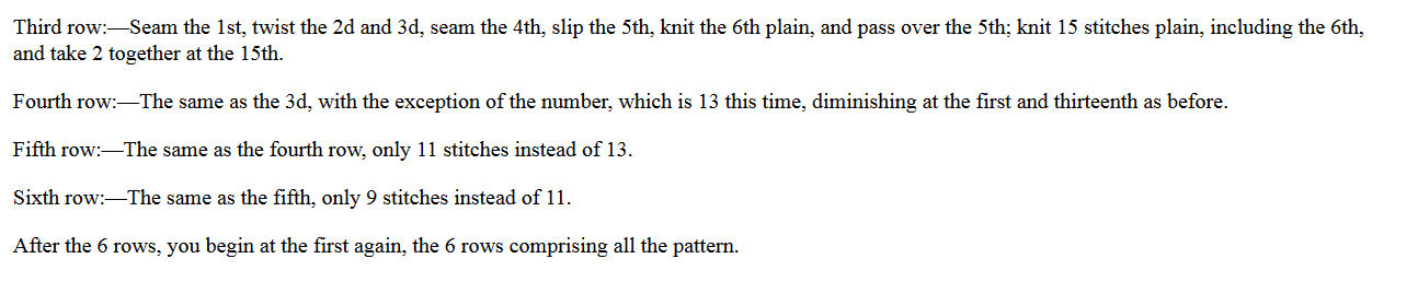 As I mentioned earlier, this is a very old pattern that uses antiquated terms in the material and knitting needle requirements. For those reasons,