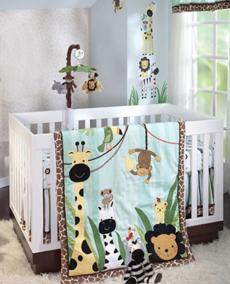 alt="Safari baby nursery ideas with zebra giraffe monkeys lions and tigers in a jungle setting"