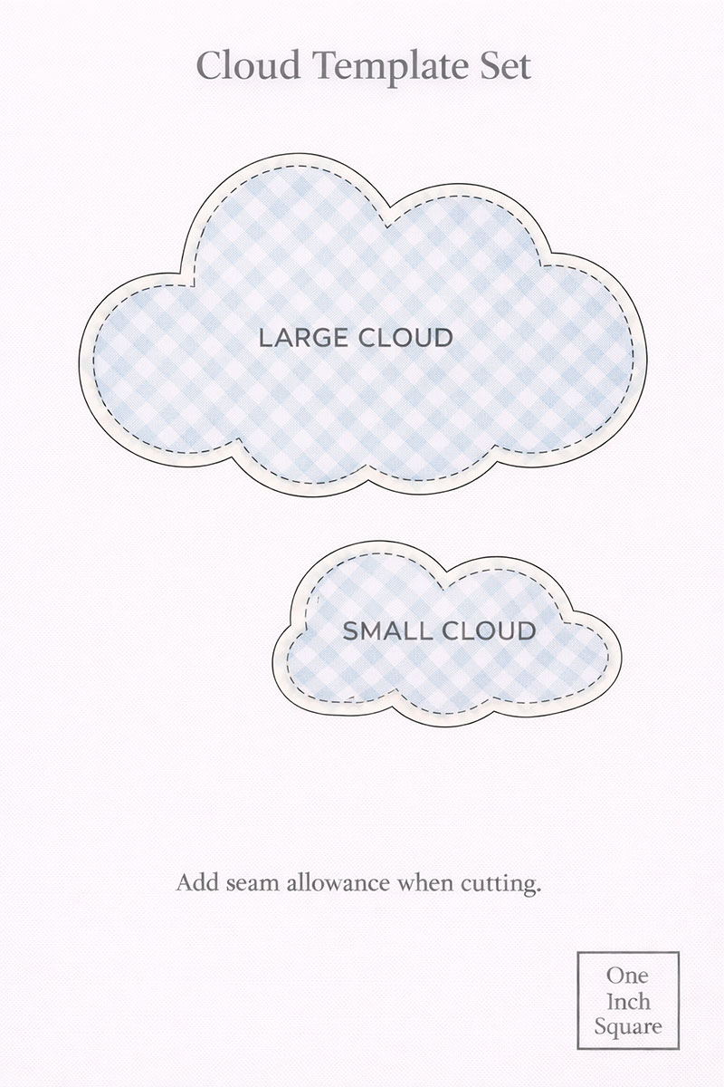 These printable quilt templates include the balloon panels, safari animal applique pieces, basket shapes, and background elements used in the quilt. Print the files at 100% scale and use the one-inch test square to confirm the templates print at the correct size before cutting fabric.