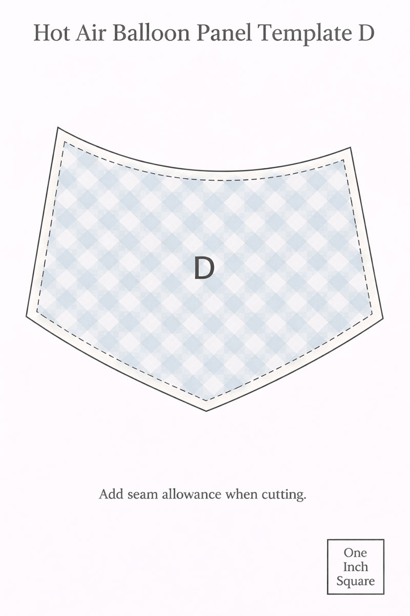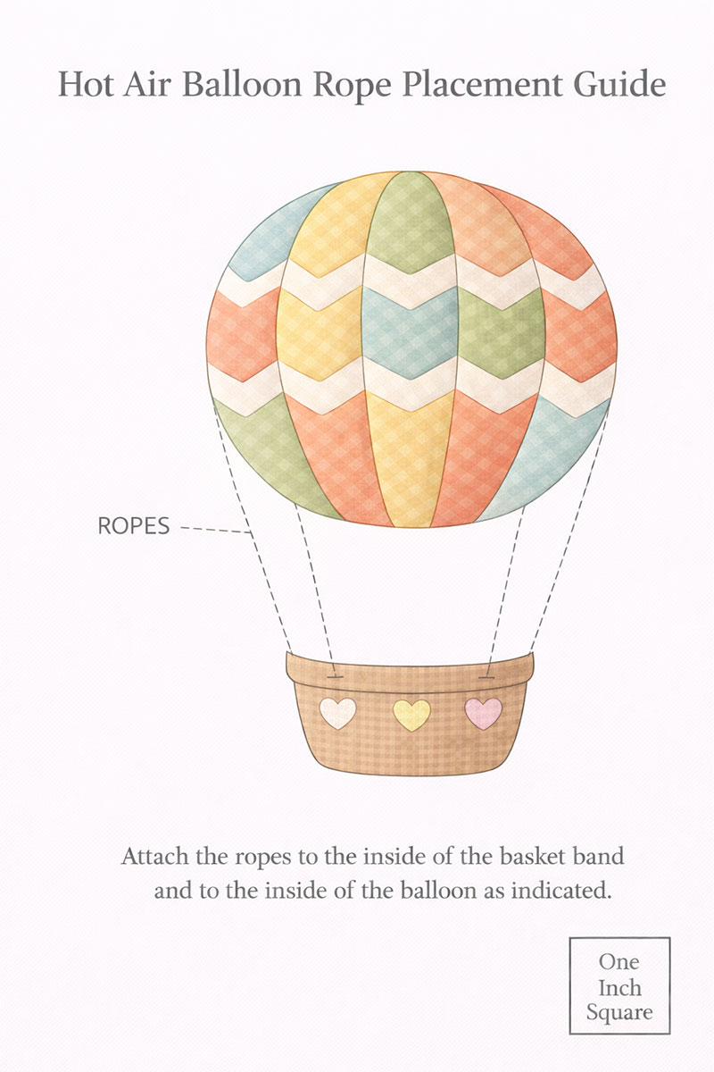 The balloon itself is made from simple pieced fabric panels arranged in angled chevron rows. These panels are easy to cut and sew, which keeps the pattern realistic for many quilters.