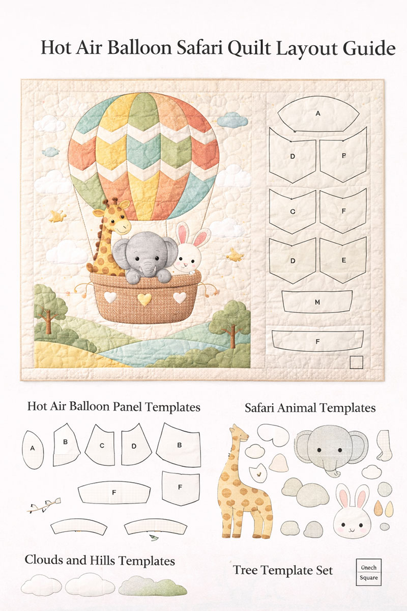 A hot air balloon safari animals crib quilt pattern is a nursery quilt design featuring applique giraffe, elephant, and bunny shapes riding in a patchwork balloon basket above soft rolling hills and clouds.