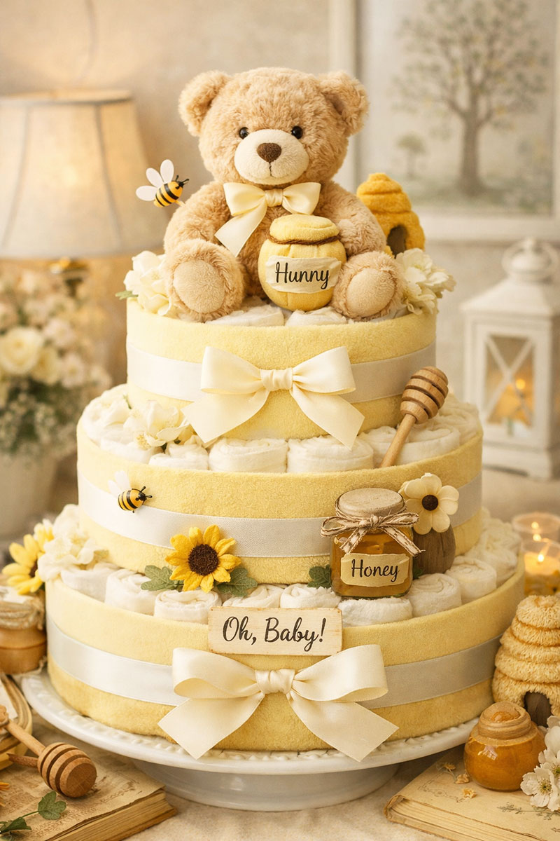 A Winnie the Pooh diaper cake is a centerpiece that will command the most attention. You can make your own diaper cake or purchase one ready made from an online baby boutique.